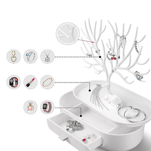 • An elegant hanging organizer designed in the shape of a deer with branching antlers. Its portable and detachable design includes a bottom tray, antlers, and a drawer, providing ample storage space for your precious accessories.
