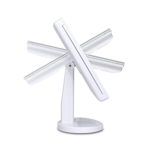 Our LED makeup mirror features 22 high-quality LED lights evenly placed around the hgih-defintion mirror. A smart touch control manages the power and adjustments for lighting brightness and colour. The tri-fold design allows wide angle viewing and the mirror can be swiveled 180 degrees and fixed in any position. An additional feature with this mirror is the two and three-times magnifying functions that come with the left mirror panel. The mirror can be powered by four AA-sized batteries or through the supplied USB cable. A detachable storage tray is also included.